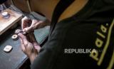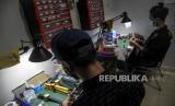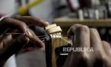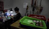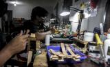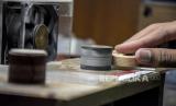 Pekerja menyelesaikan pembuatan jam tangan kayu PALA Nusantara di Galeri Ruang Pala, Jalan Kaum Cipaganti, Sukajadi, Kota Bandung, Jumat (12/11). Produk jam tangan kayu yang telah mendapatkan penghargaan Good Design Indonesia 2017 - 2020 dari Kemendagri dan dipasarkan ke sejumlah kota di Indonesia serta diekspor ke Amerika Serikat, Prancis, Kanada, Jepang dan Malaysia tersebut dijual dengan harga Rp450 ribu - Rp2 juta. Foto: Abdan Syakura/Republika (FOTO : REPUBLIKA/ABDAN SYAKURA)