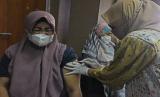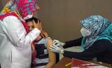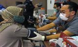 REPUBLIKA.CO.ID, SERANG -- Warga menunjukkan kartu vaksinasi COVID-19 saat acara vaksinasi keliling yang digelar para relawan Gerakan Indonesia Pasti Bisa (GIPB) di Gedung Training Center UPI di Serang, Banten, Sabtu (13/11/2021).