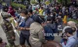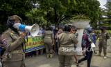 Petugas Satpol PP mengimbau warga untuk tetap menerapkan protokol kesehatan di kawasan Alun-Alun Bandung, Kota Bandung, Ahad (14/11). (FOTO : REPUBLIKA/ABDAN SYAKURA)