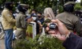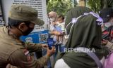 Petugas Satpol PP membantu pengunjung melakukan pemindaian kode batang sebelum memasuki kawasan Alun-Alun Bandung, Kota Bandung, Ahad (14/11). (FOTO : REPUBLIKA/ABDAN SYAKURA)