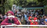 Sejumlah warga antre untuk memasuki kawasan Alun-Alun Bandung, Kota Bandung, Ahad (14/11). (FOTO : REPUBLIKA/ABDAN SYAKURA)
