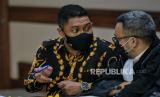 Terdakwa mantan penyidik KPK AKP Stepanus Robin Pattuju (kiri) saat menjalani sidang lanjutan kasus dugaan suap penanganan perkara yang menyeret terdakwa di Pengadilan Tipikor, Jakarta, Senin (15/11). Sidang itu beragenda pemeriksaan terdakwa Robin Pattuju bersama terdakwa pengacara Maskur Husain. Republika/Thoudy Badai (FOTO : Republika/Thoudy Badai)