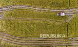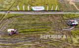 Foto udara petani mengoperasikan mesin pemotong padi saat panen raya petani milenial di areal persawahan Desa Gembongan, Banyusari, Karawang, Jawa Barat, Senin (15/11/2021). Pemerintah Provinsi Jawa Barat bersinergi dengan Bank BJB menyediakan akses permodalan petani milenial berupa penyaluran Kredit Usaha Rakyat (KUR) melalui skema kemitraan guna mengembangkan wirausaha muda pertanian di Jawa Barat. (FOTO : Antara/M Ibnu Chazar)