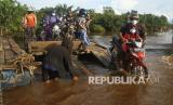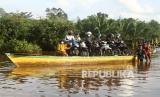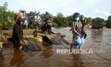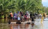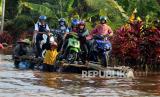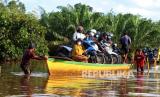 REPUBLIKA.CO.ID, SEKADAU -- Sejumlah pengendara motor menggunakan jasa ojek penyeberangan di Peniti, Kabupaten Sekadau, Kalimantan Barat, Senin (15/11/2021). Dampak dari banjir yang merendam ruas jalan nasional menuju wilayah timur Kalbar itu membuat warga setempat berinisiatif membuat rakit untuk menyeberangkan para pengendara motor yang ingin melintasi banjir tersebut dengan bayaran seikhlasnya.