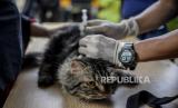 Petugas menyuntikan vaksin rabies ke kucing di halaman Kantor Kelurahan Kebon Baru, Tebet, Jakarta, Selasa (16/11). Sudin KPK Kota Administrasi Jakarta Selatan Kecamatan Tebet menyediakan 250 dosis vaksin rabies secara gratis sebagai bentuk upaya untuk mewujudkan Ibu Kota bebas rabies pada 2022. Republika/Putra M. Akbar (FOTO : Republika/Putra M. Akbar)