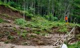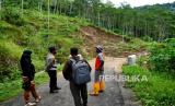 Petugas memantau lokasi tanah longsor di kawasan Air Terjun Kedung Pedhut, Girimulyo, Kulon Progo, Yogyakarta, Selasa (16/11). Tanah longsor ini menutup akses jalan dari Pengasih menuju Girimulyo. Untuk pembersihan masih menunggu bantuan alat berat. Ada empat titik tanah longsor yang terjadi di perbukitan Menoreh hari ini, dan tidak ada korban jiwa. (FOTO : Wihdan Hidayat / Republika)