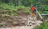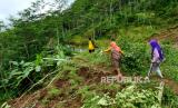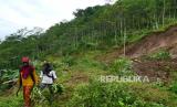 REPUBLIKA.CO.ID,YOGYAKARTA -- Warga menyeberangi tanah longsor di kawasan Air Terjun Kedung Pedhut, Girimulyo, Kulon Progo, Yogyakarta, Selasa (16/11).