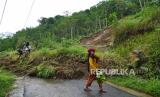 Warga menyeberangi tanah longsor di kawasan Air Terjun Kedung Pedhut, Girimulyo, Kulon Progo, Yogyakarta, Selasa (16/11). Tanah longsor ini menutup akses jalan dari Pengasih menuju Girimulyo. Untuk pembersihan masih menunggu bantuan alat berat. Ada empat titik tanah longsor yang terjadi di perbukitan Menoreh hari ini, dan tidak ada korban jiwa. (FOTO : Wihdan Hidayat / Republika)