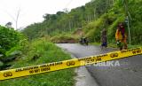 Garis batas polisi terpasang pada area lokasi tanah longsor di kawasan Air Terjun Kedung Pedhut, Girimulyo, Kulon Progo, Yogyakarta, Selasa (16/11). Tanah longsor ini menutup akses jalan dari Pengasih menuju Girimulyo. Untuk pembersihan masih menunggu bantuan alat berat. Ada empat titik tanah longsor yang terjadi di perbukitan Menoreh hari ini, dan tidak ada korban jiwa. (FOTO : Wihdan Hidayat / Republika)