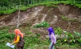 Petugas melihat lokasi tanah longsor di kawasan Air Terjun Kedung Pedhut, Girimulyo, Kulon Progo, Yogyakarta, Selasa (16/11). Tanah longsor ini menutup akses jalan dari Pengasih menuju Girimulyo. Untuk pembersihan masih menunggu bantuan alat berat. Ada empat titik tanah longsor yang terjadi di perbukitan Menoreh hari ini, dan tidak ada korban jiwa. (FOTO : Wihdan Hidayat / Republika)