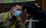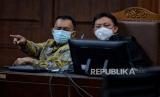 Terdakwa mantan pejabat pajak Angin Prayitno Aji (kiri) berbincang kuasa hukum saat menjalani sidang lanjutan perkara dugaan suap terkait pengurusan nilai pajak Direktorat Jenderal Pajak Kementerian Keuangan di Pengadilan Tipikor, Jakarta, Selasa (16/11). Sidang tersebut beragendakan mendengarkan keterangan saksi yang dihadirkan Jaksa Penuntut Umum (JPU) KPK. Jaksa KPK mendakwa dua mantan pejabat pajak Angin Prayitno Aji dan Dadan Ramdani menerima suap sebesar Rp 15 miliar dan SGD 4 juta atau sekitar Rp 42 miliar. Republika/Thoudy Badai (FOTO : Republika/Thoudy Badai)
