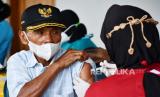 Petugas kesehatan menyuntikkan vaksin COVID-19 kepada seoarang warga saat digelar Serbuan Vaksinasi COVID-19 bagi masyarakat maritim, di Desa Garon, Balerejo, Kabupaten Madiun, Jawa Timur, Selasa (16/11/2021). Jajaran Pangkalan Utama TNI Angkatan Laut (Lantamal) V Surabaya menggelar kegiatan tersebut dengan sasaran 1.500 orang. (FOTO : ANTARA/Siswowidodo/hp.)