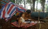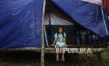 Seorang anak berada di tenda pengungsian di dalam hutan Desa Sungai Rambai, Kelurahan Mekar Jaya, Kabupaten Sintang, Kalimantan Barat, Rabu (17/11/2021). Sebanyak 30 orang korban banjir yang mengungsi ke hutan sejak sebulan terakhir karena rumah mereka tenggelam itu membutuhkan air bersih untuk mandi dan dikonsumsi, obat-obatan, sembako serta pelayanan kesehatan. (FOTO : Antara/Jessica Helena Wuysang)