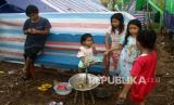 Sejumlah anak bermain di pengungsian di dalam hutan Desa Sungai Rambai, Kelurahan Mekar Jaya, Kabupaten Sintang, Kalimantan Barat, Rabu (17/11/2021). Sebanyak 30 orang korban banjir yang mengungsi ke hutan sejak sebulan terakhir karena rumah mereka tenggelam itu membutuhkan air bersih untuk mandi dan dikonsumsi, obat-obatan, sembako serta pelayanan kesehatan. (FOTO : Antara/Jessica Helena Wuysang)