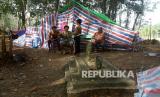 Warga berada di depan tenda pengungsian di dalam hutan Desa Sungai Rambai, Kelurahan Mekar Jaya, Kabupaten Sintang, Kalimantan Barat, Rabu (17/11/2021). Sebanyak 30 orang korban banjir yang mengungsi ke hutan sejak sebulan terakhir karena rumah mereka tenggelam itu membutuhkan air bersih untuk mandi dan dikonsumsi, obat-obatan, sembako serta pelayanan kesehatan. (FOTO : Antara/Jessica Helena Wuysang)