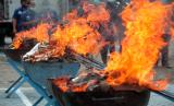 REPUBLIKA.CO.ID,SIDOARJO -- Petugas memusnahkan barang bukti rokok ilegal di Kantor Pengawasan dan Pelayanan Bea dan Cukai (KPPBC) Tipe Madya Pabean Juanda, Sidoarjo, Jawa Timur, Kamis (18/11/2021).