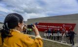 Warga berfoto di logo Pertamina Mandalika International Street Circuit, Lombok Tengah, Nusa Tenggara Barat, Kamis (18/11). Animo warga yang tinggi terhadap perhelatan World Super Bike Championship (WSBK), membuat para warga berdatangan ke kawasan sirkuit untuk melihat tempat pertandingan tersebut. Republika/Putra M. Akbar (FOTO : Republika/Putra M. Akbar)