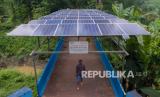 Warga melintas di bawah panel surya yang berada di Pembangkit Listrik Tenaga Surya (PLTS) Irigasi Tanjung Raja yang dibangun melalui dana CSR PT Bukit Asam Tbk di Desa Tanjung Raja, Kecamatan Muara Enim, Kabupaten Muara Enim, Sumatera Selatan, Kamis (18/11/2021). PLTS yang memiliki kapasitas sebesar 16 kilowatt tersebut dipergunakan untuk menghidupkan pompa air yang menyalurkan air dari Sungai Enim ke lahan persawahan milik warga yang berjarak sekitar satu kilometer dengan ketinggian sekitar 30 meter. (FOTO : Antara/Nova Wahyudi)