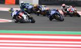 Pembalap Indonesia yang tergabung dalam tim Ten Kate Racing Yamaha WSS Galang Hendra Pratama (55) melaju bersama para pembalap lainnya saat saat sesi latihan bebas pertama (FP1) kelas WorldSSP di Pertamina Mandalika International Street Circuit, Lombok Tengah, Nusa Tenggara Barat (NTB), Jumat (19/11/2021). (FOTO : ANTARA/Andika Wahyu)
