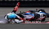 Pembalap tim BMW MOTORRAD WorldSBK Tom Sykes terjatuh saat sesi latihan bebas pertama (FP1) di Pertamina Mandalika International Street Circuit, Lombok Tengah, Nusa Tenggara Barat (NTB), Jumat (19/11/2021). (FOTO : Antara/Sigid Kurniawan)