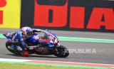 Pembalap Pata Yamaha With Brixx WorldSBK Toprak Razgatlioglu melaju di samping ofisial timnya saat sesi latihan bebas kedua (FP2) WSBK di Pertamina Mandalika International Street Circuit, Lombok Tengah, Nusa Tenggara Barat, Jumat (19/11/2021). (FOTO : ANTARA/Andika Wahyu)