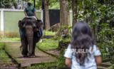 Pengunjung didampingi pawang satwa menaiki gajah tunggang di Bandung Zoological Garden (Bazooga), Kota Bandung, Ahad (21/11). (FOTO : REPUBLIKA/ABDAN SYAKURA)