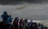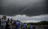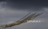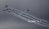 Pesawat Jupiter Aerobatic Team TNI AU saat melakukan atraksi di kawasan Pertamina Mandalika International Street Circuit, Lombok Tengah, Nusa Tenggara Barat, Ahad (21/11). (FOTO : Republika/Putra M. Akbar)