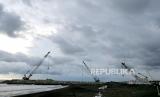 Proses pembangunan proyek pengaman Sungai Bogowonto di Kulonprogo, Yogyakarta, Senin (22/11). Proyek yang menelan biaya Rp 764 miliar ini difungsikan sebagai penangkal banjir Bandara Internasional Yogyakarta. Proyek ini ditargetkan selesai pada 2023 mendatang. (FOTO : Wihdan Hidayat / Republika)