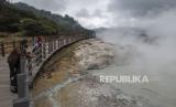 Sejumnlah wisatawan mengunjungi Kawah Sikidang di Dataran Tinggi Dieng, Batur, Kabupaten Banjarnegara, Jawa Tengah, Selasa (23/11/2021). Sektor pariwisata di Dieng kembali menggeliat usai obyek wisata kembali dibuka sekitar dua pekan terakhir setelah adanya relaksasi dalam PPKM level 3 di Banjarnegara. (FOTO : ANTARA /Aditya Pradana Putra)