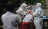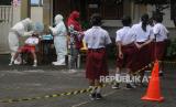 REPUBLIKA.CO.ID,SOLO -- Petugas kesehatan mengambil sampel tes usap PCR pelajar di SD Negeri Kestalan 5, Solo, Jawa Tengah, Selasa (23/11/2021).