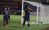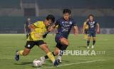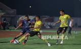 REPUBLIKA.CO.ID, BANTUL -- Pesepak bola Arema FC Dendi Santoso (kiri) berebut bola dengan pesepak bola Barito Putera Miftah (tengah) saat pertandingan Liga 1 di Stadion Sultan Agung, Bantul, DI Yogyakarta, Selasa (23/11/2021). Arema FC menang atas Barito Putera dengan skor 2-1.