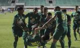 Sejumlah pesepak bola Persebaya Surabaya melakukan selebrasi seusai menjebol gawang Persita Tangerang saat pertandingan Liga 1 di Stadion Maguwoharjo, Sleman, DI Yogyakarta, Rabu (24/11/2021). Persebaya Surabaya berhasil mengalahkan Persita Tangerang dengan skor 4-0. (FOTO : ANTARA/Ananda Erlangga)