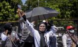 Seorang guru melakukan aksi teatrikal saat aksi Indonesia Darurat Guru PNS di kawasan Monumen Perjuangan Rakyat Jawa Barat (Monpera), Kota Bandung, Kamis (25/11). Dalam aksi yang bertepatan dengan peringatan Hari Guru Nasional 2021 tersebut menuntut agar guru yang masih berstatus honorer bisa diangkat menjadi PNS atau Pegawai Pemerintah dengan Perjanjian Kerja (PPPK). Hal tersebut dikarenakan Indonesia masih kekurangan 1,3 juta guru di sekolah negeri. (FOTO : REPUBLIKA/ABDAN SYAKURA)
