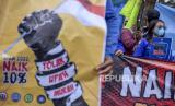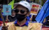 Sejumlah buruh dari berbagai serikat buruh berunjuk rasa di depan Gedung Sate, Jalan Diponegoro, Kota Bandung, Kamis (25/11). Dalam unjuk rasa tersebut, mereka mendesak pemerintah untuk mencabut UU Cipta Kerja yang dinilai merugikan buruh dan menolak Peraturan Pemerintah (PP) Nomor 36 Tahun 2021 tentang Pengupahan serta menolak penetapan Upah Minimum Provinsi (UMP) Jawa Barat tahun 2022. Foto: Republika/Abdan Syakura (FOTO : REPUBLIKA/ABDAN SYAKURA)