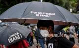 Aktivis melakukan aksi kamisan di depan Istana Merdeka, Jakarta, Kamis (25/11). Aksi Kamisan ke 706 kembali digelar secara offline setelah melakukan aksi secara online selama pandemi Covid-19. Dalam aksinya mereka menuntut komitmen Presiden Jokowi dalam menuntaskan kasus pelanggaran Hak Asasi Manusia (HAM) serta memberikan keadilan bagi keluarga korban. (FOTO : Republika/Thoudy Badai)