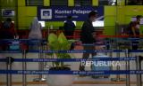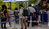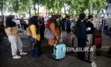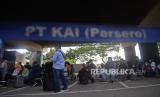 Sejumlah penumpang melakukan check in sebelum keberangkatan di Stasiun Gambir, Jakarta, Kamis (25/11). Pemerintah telah resmi menerbitkan aturan Pemberlakuan Pembatasan Kegiatan Masyarakat (PPKM) Level 3 saat Natal dan tahun baru mendatang. Dalam aturan tersebut Aparatur Sipil Negara (ASN), pegawai Badan Usaha Milik Negara (BUMN), karyawan swasta serta personel Tentara Nasional Indonesia (TNI) dan Polri dilarang mengambil cuti pada periode 24 Desember hingga 2 Januari 2022. (FOTO : Prayogi/Republika.)