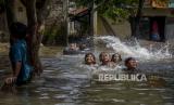 Sejumlah anak bermain di genangan air saat banjir menggenangi Kampung Bojongasih, Kecamatan Dayeuhkolot, Kabupaten Bandung, Jumat (26/11). Banjir akibat intensitas curah hujan yang tinggi dan meluapnya Sungai Citarum pada Kamis (25/11) tersebut menyebabkan dua kecamatan yakni Kecamatan Dayeuhkolot dan Baleendah terendam banjir setinggi 30 sentimeter hingga 100 sentimeter. Foto: Republika/Abdan Syakura (FOTO : REPUBLIKA/ABDAN SYAKURA)