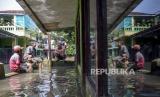Sejumlah warga beraktivitas di halaman rumah yang terendam banjir di Kampung Bojongasih, Kecamatan Dayeuhkolot, Kabupaten Bandung, Jumat (26/11). Banjir akibat intensitas curah hujan yang tinggi dan meluapnya Sungai Citarum pada Kamis (25/11) tersebut menyebabkan dua kecamatan yakni Kecamatan Dayeuhkolot dan Baleendah terendam banjir setinggi 30 sentimeter hingga 100 sentimeter. Foto: Republika/Abdan Syakura (FOTO : REPUBLIKA/ABDAN SYAKURA)
