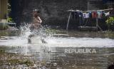 Seorang anak bermain di genangan air saat banjir menggenangi Kampung Bojongasih, Kecamatan Dayeuhkolot, Kabupaten Bandung, Jumat (26/11). Banjir akibat intensitas curah hujan yang tinggi dan meluapnya Sungai Citarum pada Kamis (25/11) tersebut menyebabkan dua kecamatan yakni Kecamatan Dayeuhkolot dan Baleendah terendam banjir setinggi 30 sentimeter hingga 100 sentimeter. Foto: Republika/Abdan Syakura (FOTO : REPUBLIKA/ABDAN SYAKURA)