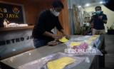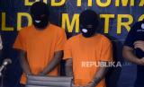 Tersangka dihadirkan saat rilis pembunuhan driver ojek online disertai dengan mutlasi di Mapolda Metro Jaya, Ahad (28/11). Polda Metro Jaya menetapkan tiga orang sebagai tersangka yang salah satunya masih DPO dalam kasus tersebut serta mangamankan barang bukti berupa golok, kayu balok, mobil dan pakaian korban. (FOTO : Prayogi/Republika.)