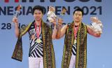 Marcus/Kevin berhasil menjuarai Indonesia Open 2021 setelah menang 21-14, 21-18 atas Ganda Putra Jepang.