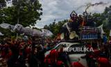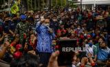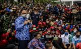 REPUBLIKA.CO.ID,JAKARTA -- Gubernur DKI Jakarta, Anies Rasyid Baswedan menyambangi ratusan massa buruh pengunjuk rasa di depan Balai Kota DKI, Jalan Medan Merdeka Selatan, Jakarta Pusat, Senin (29/11).