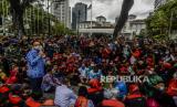 Sejumlah massa buruh saat melaksanakan aksi unjuk rasa di depan Balai Kota Jakarta, Senin (29/11). Aksi tersebut bertujuan untuk menolak Upah Minimum Provinsi (UMP) DKI Jakarta yang hanya naik Rp 37.749 atau sekitar 0,8 persen dibandingkan tahun lalu. Republika/Putra M. Akbar (FOTO : Republika/Putra M. Akbar)