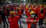 Massa buruh menggelar aksi terkait penetapan upah minimum provinsi (UMP) 2022.