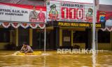 Petugas Kepolisian berjaga di Makopolres Hulu Sungai Tengah yang terendam banjir di Barabai, Kabupaten Hulu Sungai Tengah, Kalimantan Selatan, Senin (29/11/2021). Pemerintah Kabupaten Hulu Sungai Tengah menaikan status dari siaga bencana menjadi tanggap darurat bencana selama sepekan terhitung dari 28 November 2021 akibat banyak warga yang terisolir dan mengungsi serta ketinggian air semakin meningkat. (FOTO : Antara/Bayu Pratama S)