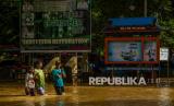Warga melintasi banjir di lapangan Dwi Warna, Barabai, Kabupaten Hulu Sungai Tengah, Kalimantan Selatan, Senin (29/11/2021). Pemerintah Kabupaten Hulu Sungai Tengah menaikan status dari siaga bencana menjadi tanggap darurat bencana selama sepekan terhitung dari 28 nopember 2021 akibat banyak warga yang terisolir dan mengungsi serta kenaikan air semakin meningkat. (FOTO : Antara/Bayu Pratama S)