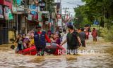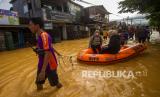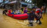 REPUBLIKA.CO.ID, HULU SUNGAI TENGAH -- Relawan mengevakuasi warga yang terdampak banjir di Barabai, Kabupaten Hulu Sungai Tengah, Kalimantan Selatan, Senin (29/11/2021). Berdasarkan data sementara dari Badan Penanggulangan Bencana Daerah (BPBD) Kabupaten Hulu Sungai Tengah sebanyak 3.944 jiwa mengungsi akibat terdampak banjir.