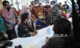 Direktur Pengembangan Investasi BPJamsostek, Edwin Ridwan (kedua kanan), Menteri Ketenagakerjaan RI Ida Fauziyah (kedua kiri) dan Direktur Utama Bank BTN Haru Koesmahargyo (kiri) meninjau peserta akad massal kredit rumah pekerja Manfaat Layanan Tambahan (MLT) program Jaminan Hari Tua di Tangerang, Banten, Selasa (30/11). Kegiatan akad massal yang diikuti oleh 150 peserta secara hybrid tersebut merupakan bentuk respons atas terbitnya Peraturan Menteri Ketenagekerjaan (Permenaker) Nomor 17 Tahun 2021. (FOTO : Tahta Aidilla/Republika)