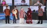 Menteri Ketenagakerjaan Ida Fauziyah (tengah) bersama Direktur Utama Bank BTN Haru Koesmahargyo (kanan) dan Direktur Pengembangan Investasi BP Jamsostek Edwin Ridwan (kiri) memberikan kunci rumah secara simbolis kepada peserta akad massal kredit rumah pekerja Manfaat Layanan Tambahan (MLT) Program Jaminan Hari Tua di Tangerang, Banten, Selasa (30/11). Bank BTN berkolaborasi dengan Kementerian Ketenagakerjaan dan BP Jamsostek menggelar akad massal kredit rumah pekerja MLT program Jaminan Hari Tua guna memperluas fasilitas pembiayaan kepada pada pekerja diantaranya fasilitas kredit kepemilikan rumah dan renovasi rumah dan menargetkan realisasi kredit MLT tersebut mencapai Rp100 miliar hingga akhir tahun 2021. (FOTO : Tahta Aidilla/Republika)