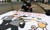 Pengurus Aliansi Jurnalis Independen (AJI) Jakarta menggambar mural di atas kain saat menggelar aksi solidaritas terhadap jurnalis Nurhadi di depan Kejaksaan Agung, Jakarta, Rabu (1/12/2021). Dalam aksi tersebut mereka meminta Kejaksaan Tinggi Jawa Timur untuk menuntut seberat-beratnya dua terdakwa aparat kepolisian yang melakukan kekerasan kepada jurnalis Tempo Nurhadi. (FOTO : Antara/Hafidz Mubarak A)